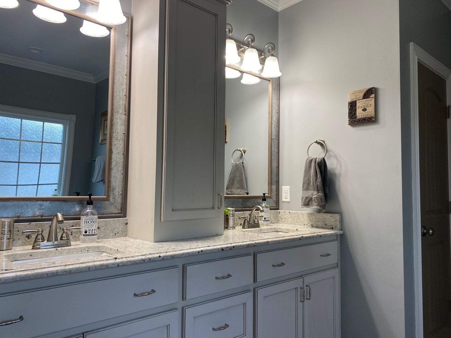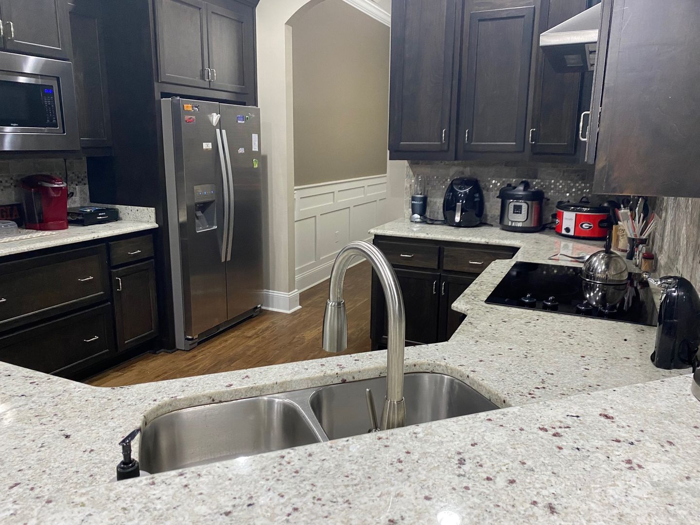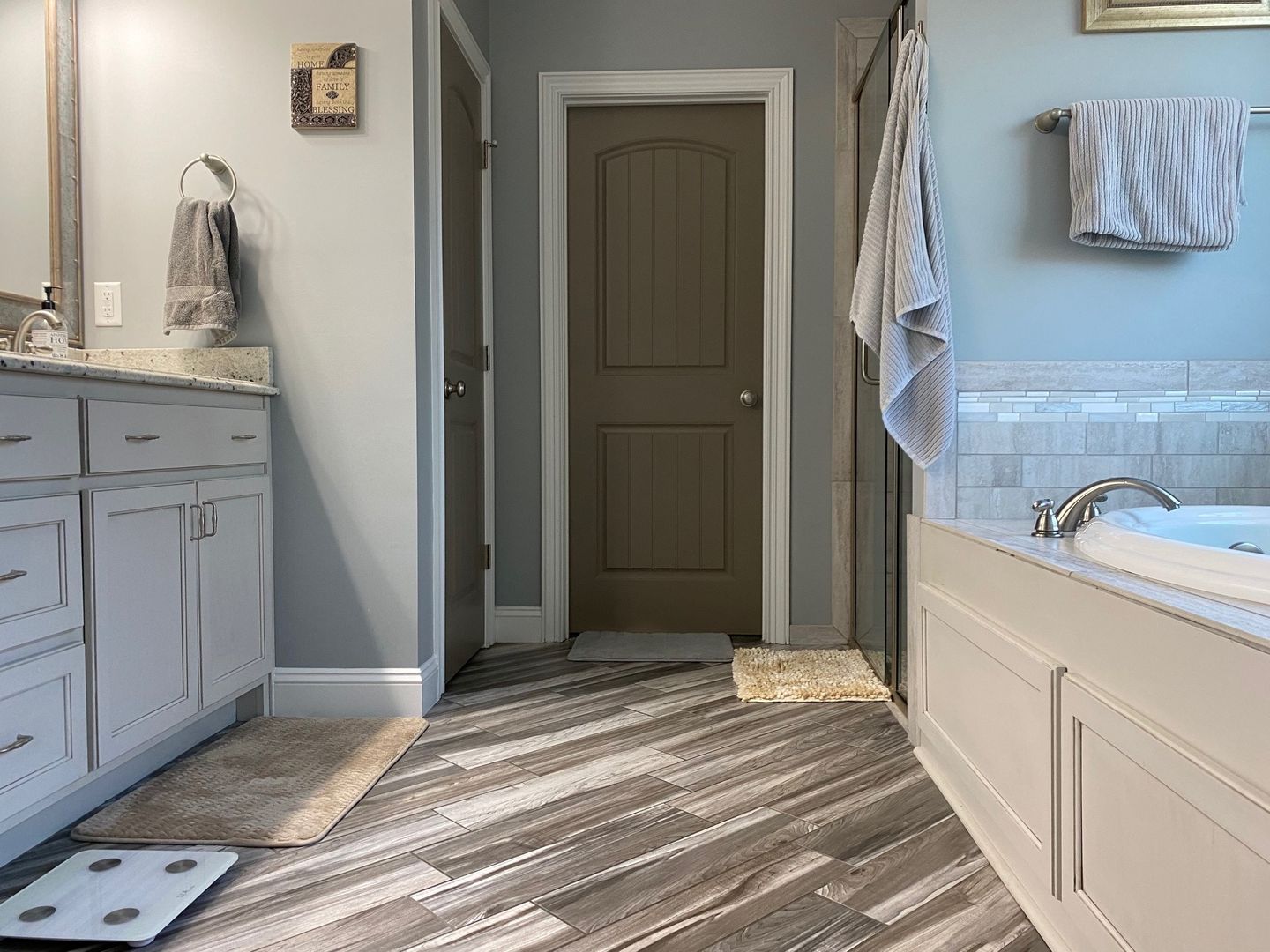Four bedrooms, three full bathrooms, with an open split floor plan. Kitchen has custom cabinets, granite counter tops, and a tiled back splash. Master bathroom has a double vanity, separate tiled shower and garden tub. This property also has a 3 car garage and a screened in back porch.